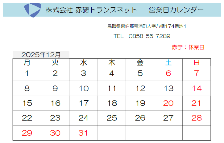 株式会社赤碕トランスネットの「12月営業日」についてお知らせいたします。