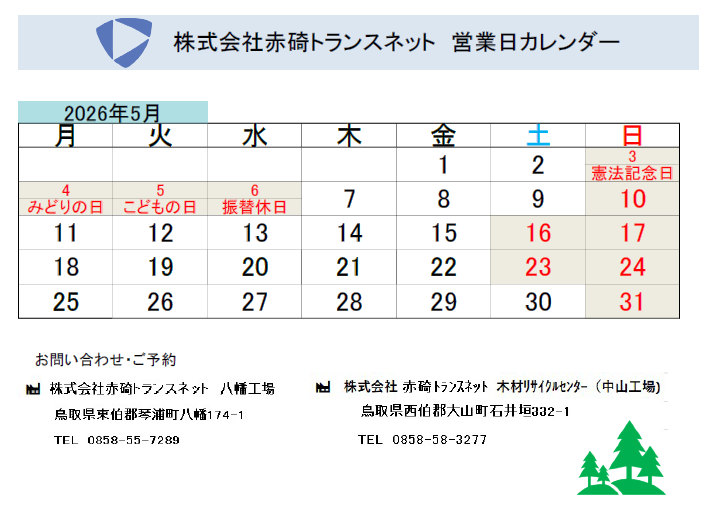 株式会社赤碕トランスネットの「5月営業日」についてお知らせいたします。